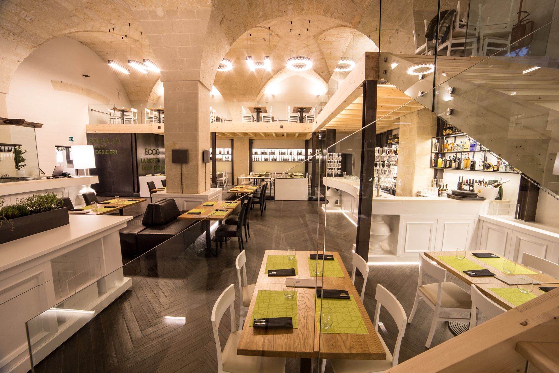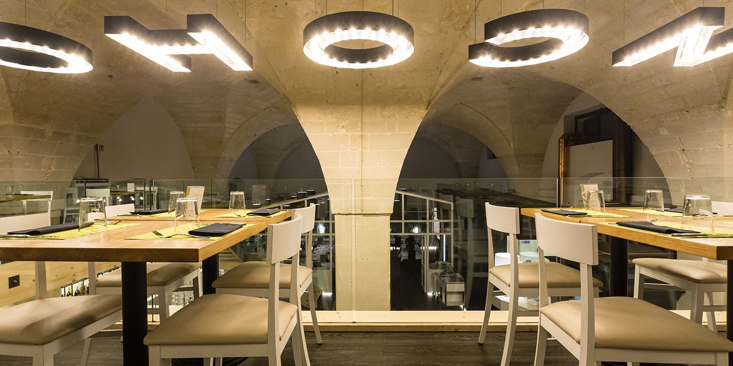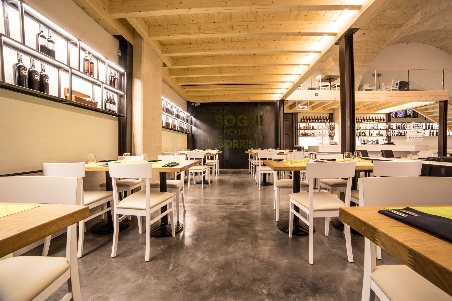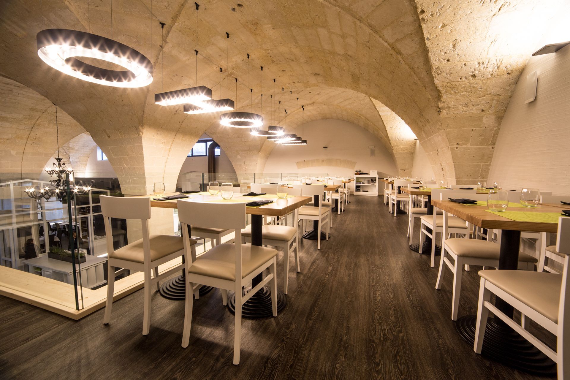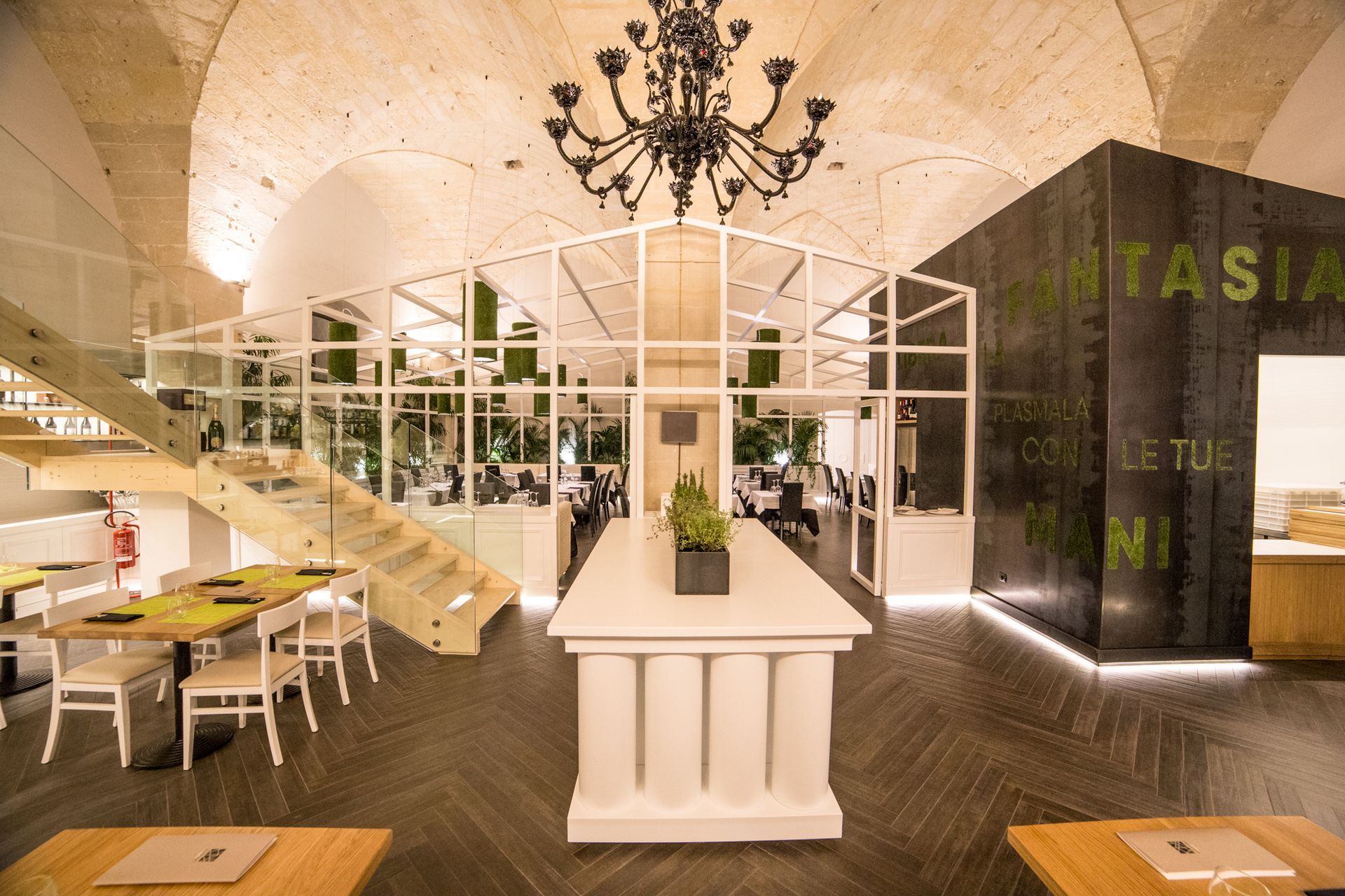 Circa 450 mq della sala interna e più di 400 mq esterni, al piano terra di un ex edificio industriale della vecchia zona artigianale di Galatina, trasformati in un ristorante dai tratti contemporanei, ma allo stesso tempo luminoso e accogliente, che combina la cucina della tradizione con un pizzico di modernità.
