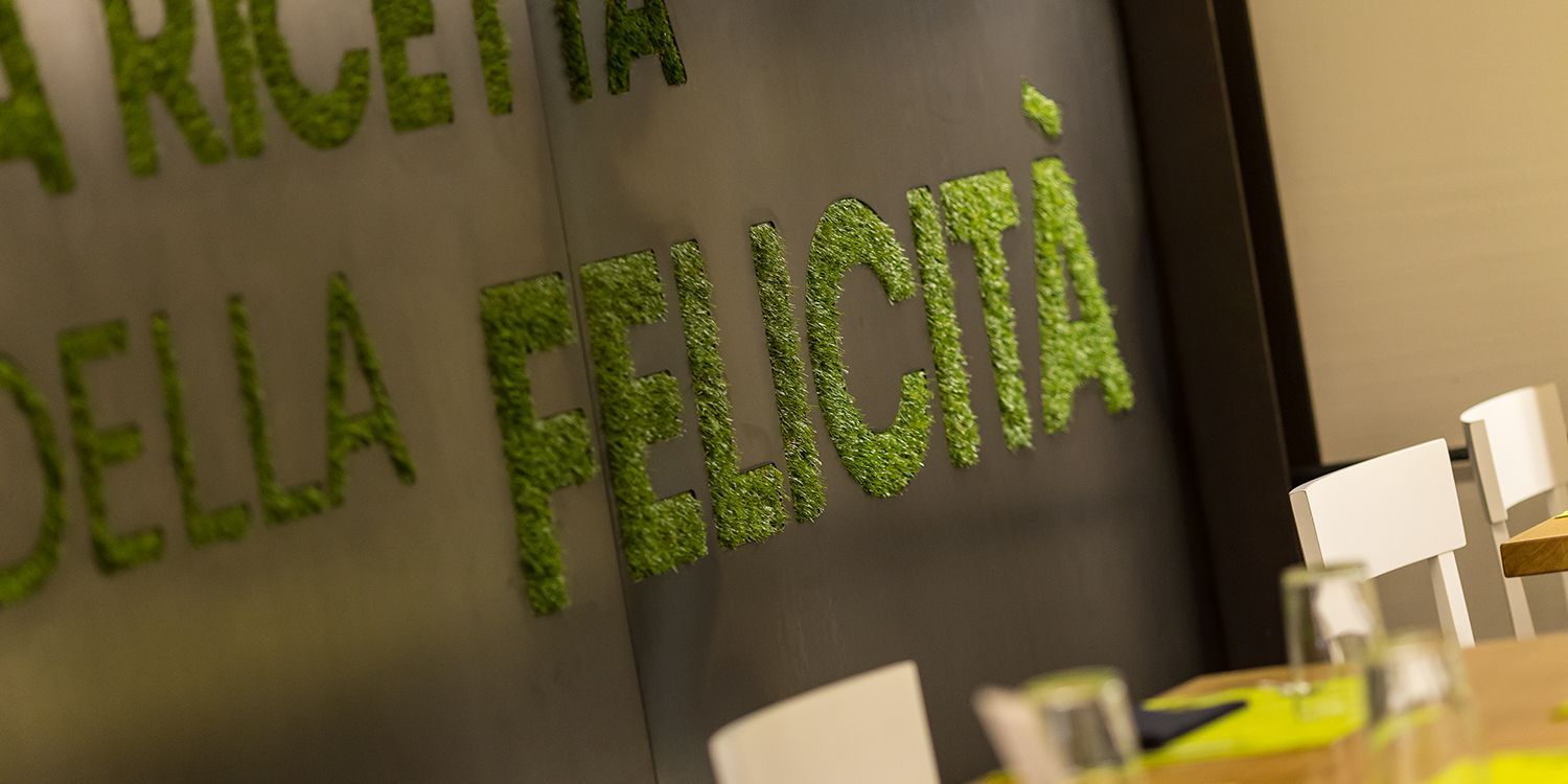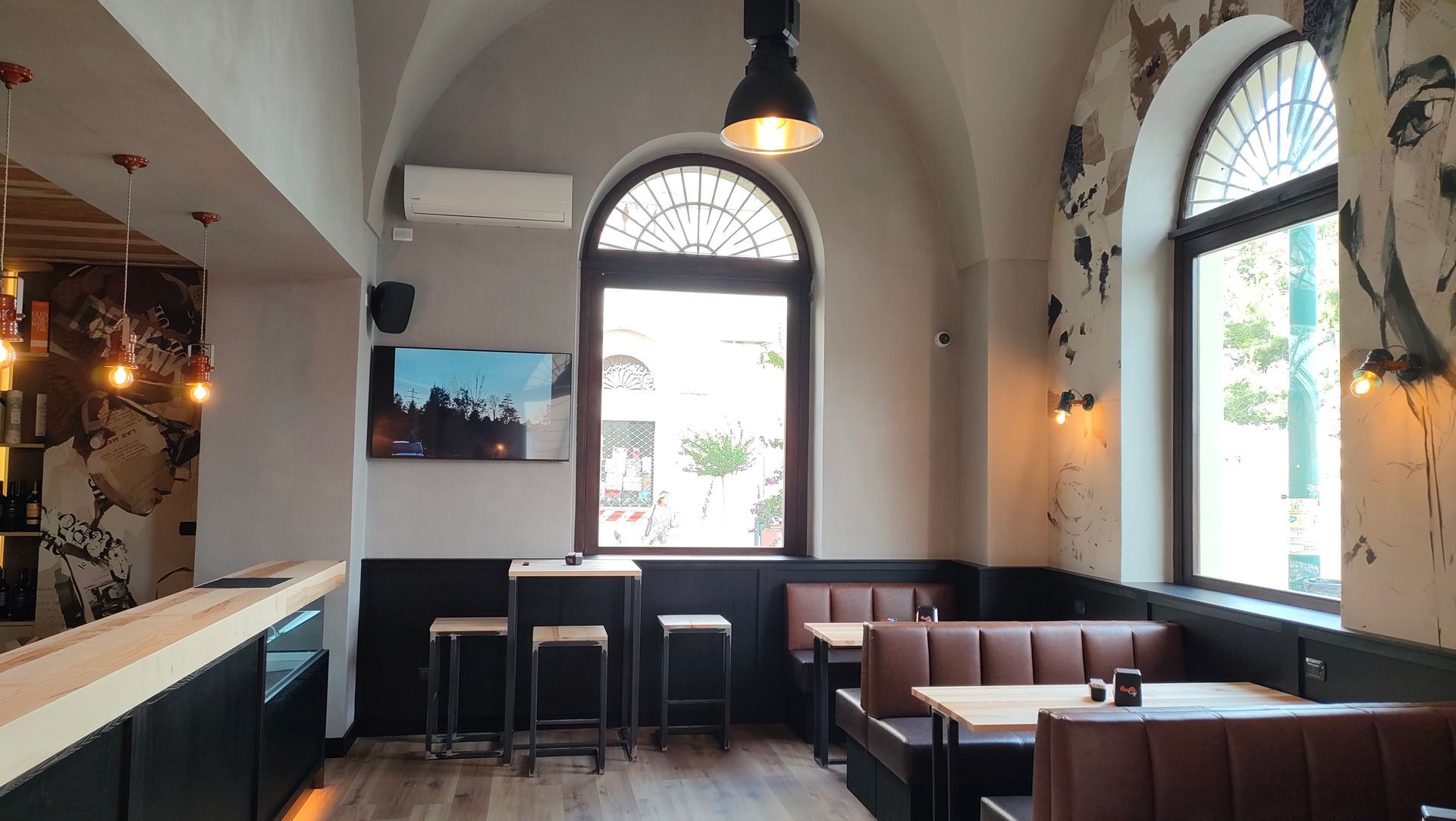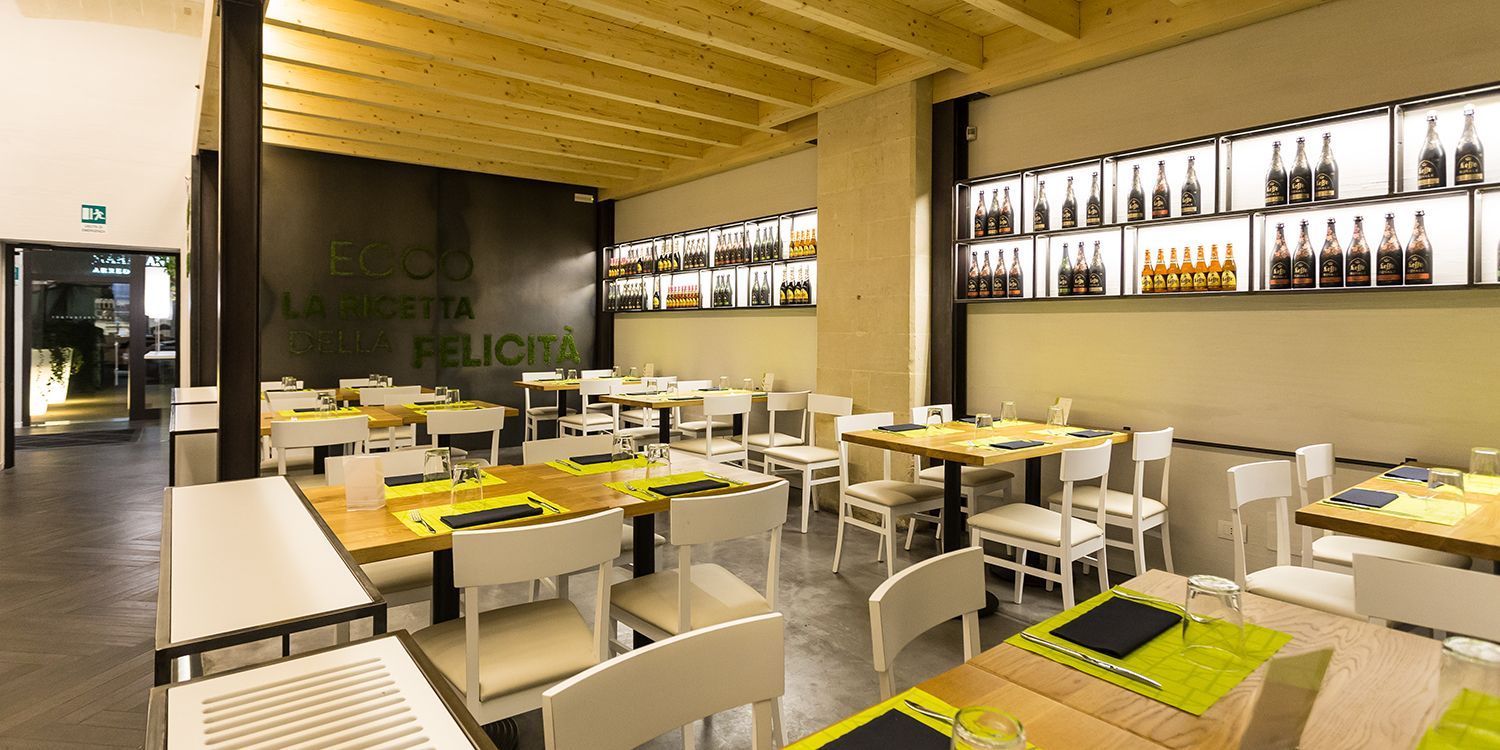 La sala ristorante è arredata con sedute imbottite e rivestite in pelle, mentre la sala pizzeria è allestita con tavoli in legno e ferro e sedie in stile vintage. Ulteriori posti a sedere per l’area pizzeria trovano posto su un secondo livello realizzato con una struttura di travi a vista in legno naturale, e completato da un parapetto di cristallo.