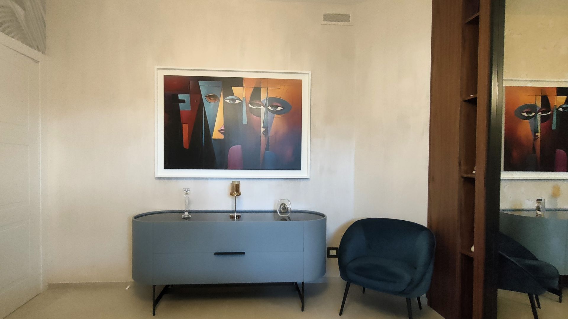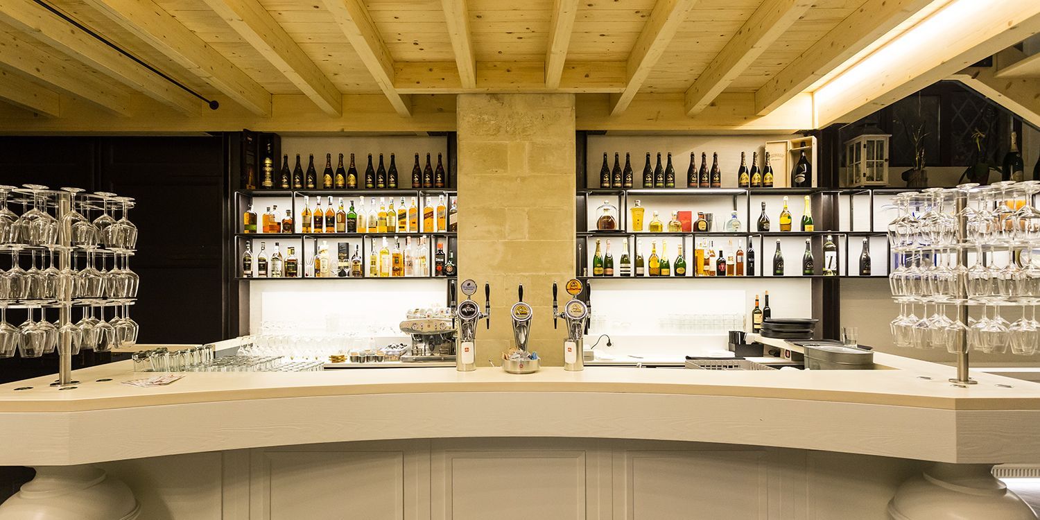 I listoni di parquet scuro a pavimento, le boiserie in legno pitturato bianco e il grande chandelier di cristallo nero ingentiliscono l’aspetto generale del locale, caratterizzato da grandi superfici verticali materiche, come le strutture in pietra leccese stonacata, le pareti trattate con intonaco rigato a spessore e le quinte in lamiera di ferro grezzo.